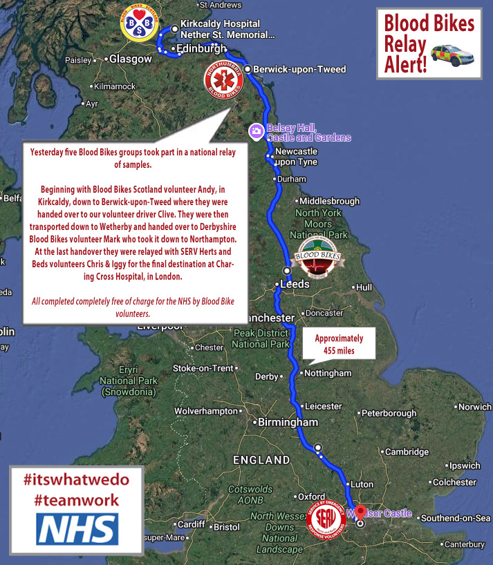 Beginning with Blood Bikes Scotland volunteer Andy, in Kirkcaldy, down to Berwick-upon-Tweed where they were handed over to our volunteer driver Clive. They were then transported down to Wetherby and handed over to Derbyshire Blood Bikes volunteer Mark who took it down to Northampton. At the last handover they were relayed with Serv Herts & Beds volunteers Chris & Iggy for the delivery to the final destination at Charing Cross Hospital, in London.